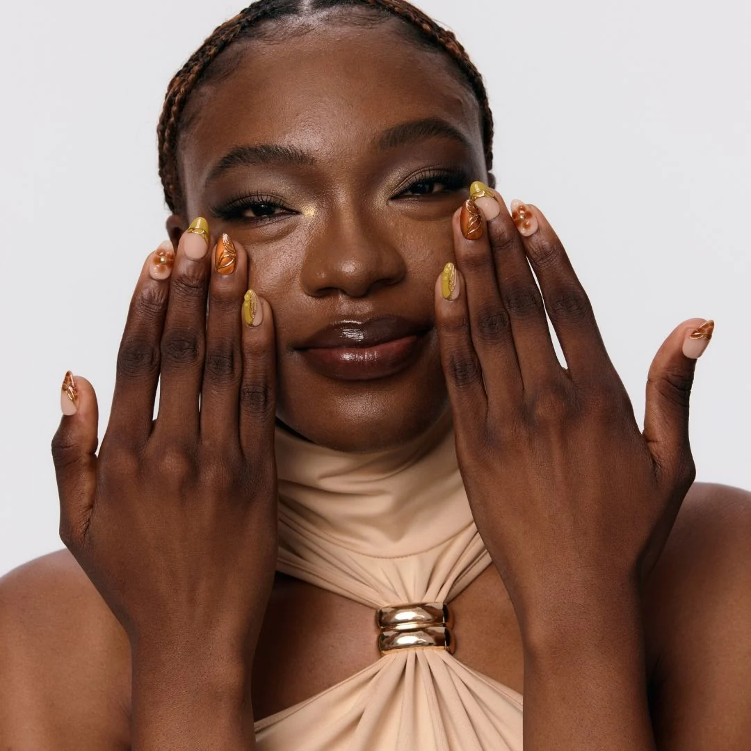 Amber Bloom by Ersa Nails combines earthy elegance with a touch of nature. The nude base is beautifully complemented by a tortoiseshell French tip on the thumb, creating a unique and sophisticated look. Brown floral patterns adorn the index finger, while the ring finger features a stunning cat-eye effect. Green accents at the tips of the middle and pinky fingers add a fresh, vibrant pop, while golden lines delicately enhance the design. Effortlessly chic and easy to apply, Amber Bloom offers a versatile and captivating style for any occasion.