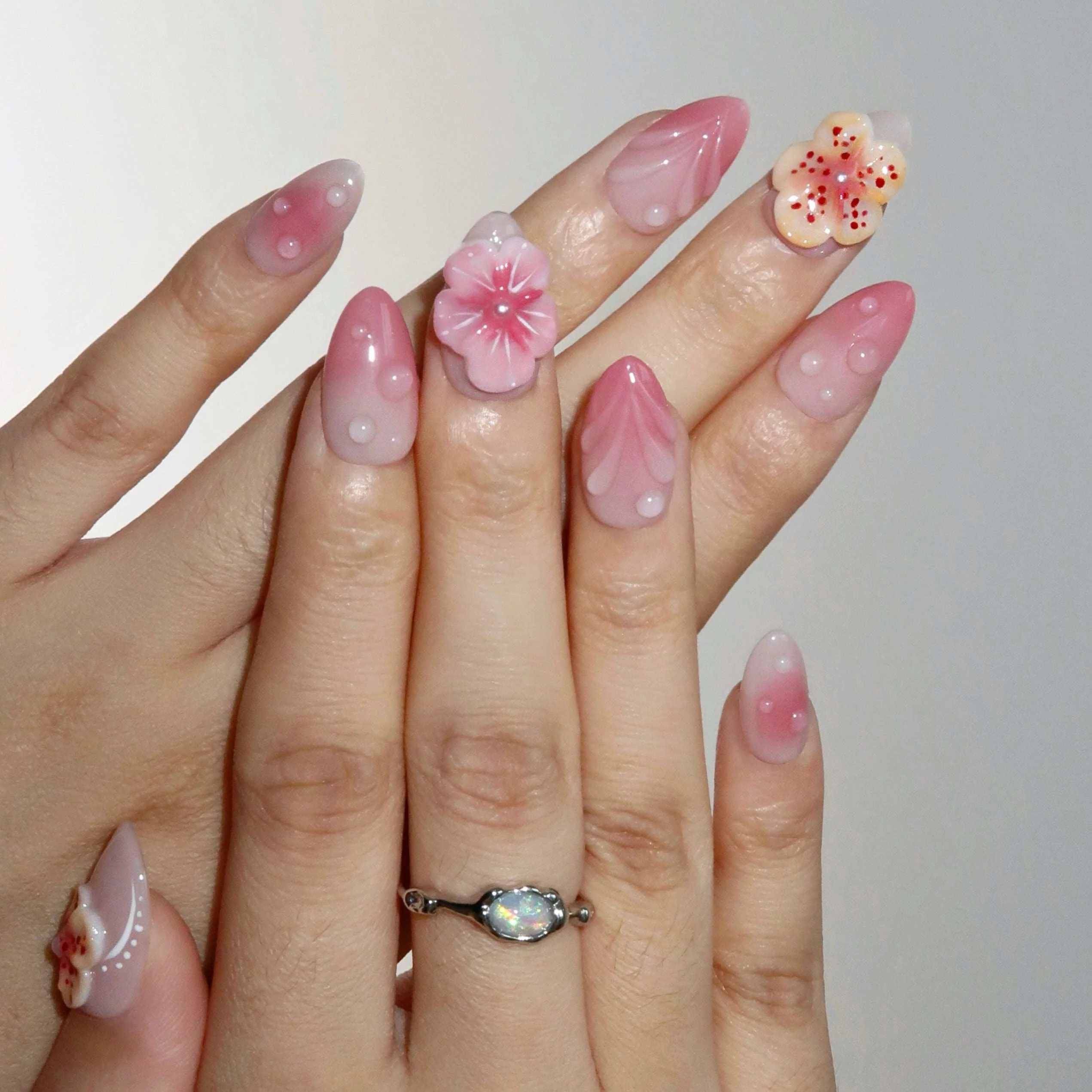 Capture the essence of seaside elegance with Beachside Fizz Press-on Nails by Ersa Nails. These nails feature a soft pink base color, exuding a delicate and charming appeal. Adorned with intricate 3D floral decorations, each nail transforms into a blooming masterpiece. Transparent water droplet beads add a refreshing and unique touch, reminiscent of gentle ocean waves. Perfect for those who adore a blend of natural beauty and sophistication, Beachside Fizz nails are easy to apply and comfortable to wear, ensuring your fingertips are always beach-ready and beautifully adorned.