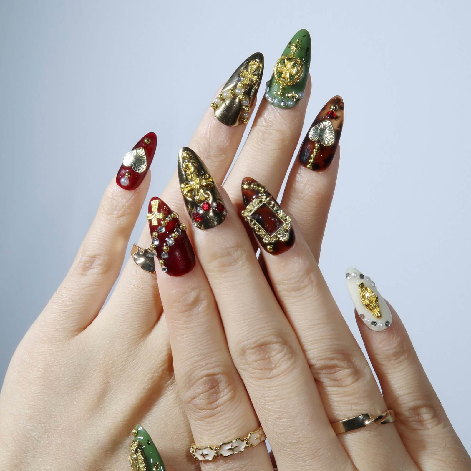 Embrace the beauty of timeless elegance with Eternal Grace. This luxurious set features a stunning combination of red, green, and white tones, creating a bold yet graceful look. The intricate design is adorned with gold religious symbols, including a cross, Madonna, and heart motifs, adding a touch of spirituality and sophistication. Pearls, gemstones, and golden beads further enhance the elegance of this set, making it the perfect choice for those who seek a refined and meaningful style. Eternal Grace is not just a nail set—it's a statement of devotion and beauty.