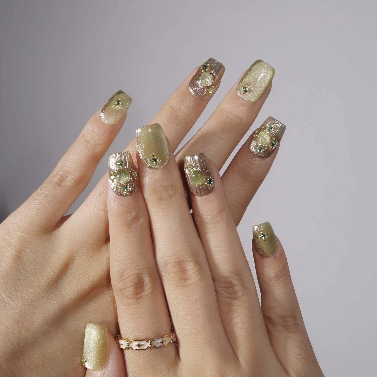 Forest Fairy from Ersa Nails is a mystical and elegant press-on nails set that captures the magic of the forest. Featuring a rich green cat-eye design, this set is enhanced with shimmering gold elements and intricate gold textures that evoke a sense of enchantment. Sparkling gems add a touch of luxury, making these nails perfect for those who want to bring a little magic to their everyday look. Embrace the charm of the forest with Forest Fairy and let your nails shine with natural beauty.