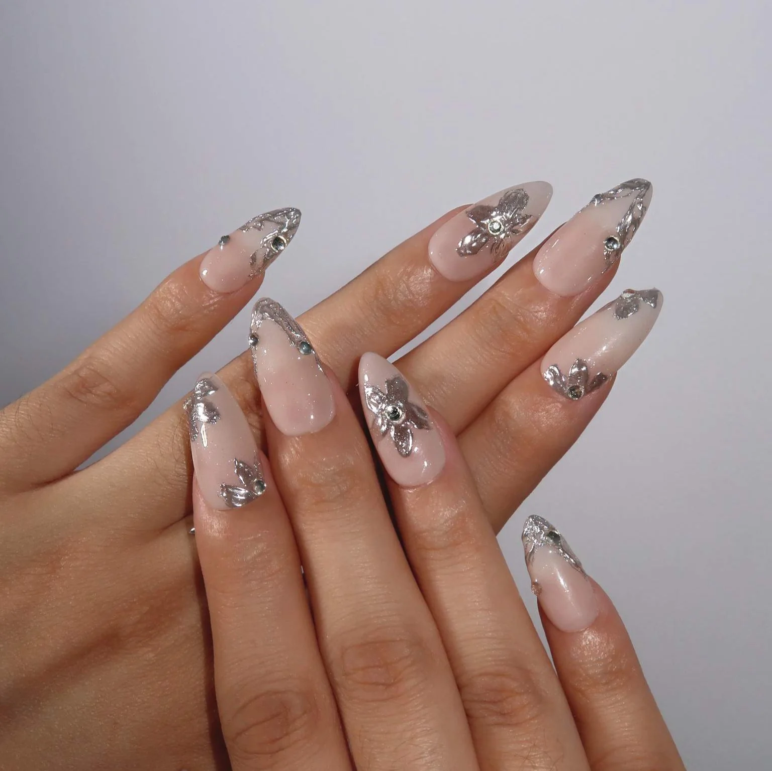 Embrace a touch of icy elegance with Frosty Petal Press-on Nails by Ersa Nails. This sophisticated design features a nude base color, beautifully complemented by delicate silver floral accents and sleek silver lines. The addition of sparkling rhinestones adds a hint of glamour, making these nails a perfect blend of simplicity and luxury. Frosty Petal nails offer a refined yet eye-catching look, ideal for those who appreciate a subtle, wintry charm that can elevate any outfit.