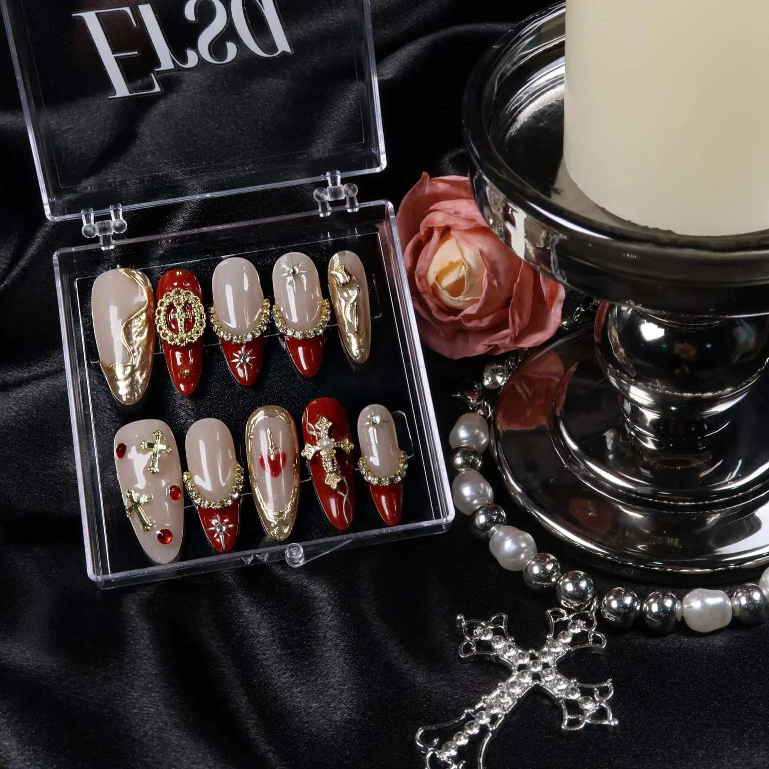 Embrace regal elegance with Ersa Nails' 'La Reine', a set of press-on nails that exudes a sovereign grace. Each nail is a tribute to the grandeur of queens past, featuring rich tones and embellishments that command attention. Accents of gold and subtle gemstones add a touch of majesty, perfect for any woman ready to ascend her daily throne with confidence and style. Whether it's for a special event or to add a royal flair to your everyday look, 'La Reine' transforms your fingertips into a crown jewel of beauty.