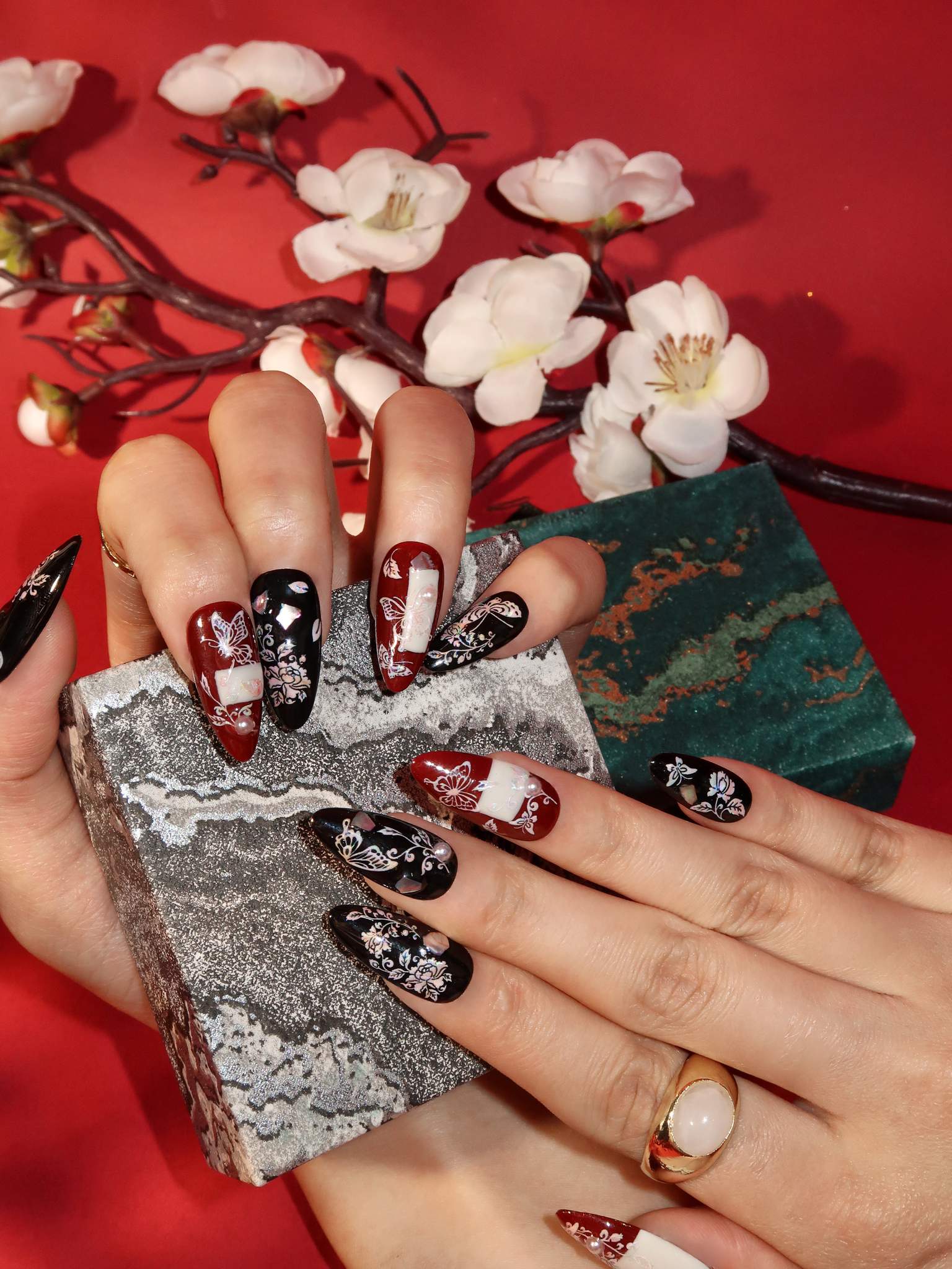 Immerse yourself in the luxurious artistry of ancient China with the Mamianqun press-on nail set. Inspired by the sumptuous mother-of-pearl inlay work known as 'luodian,' this set mirrors the traditional craftsmanship that adorns esteemed artifacts. Each nail is a modern canvas, reflecting the lustrous sheen of shell pieces intricately arranged to form floral patterns reminiscent of those found on the famed horse-face skirts. The rich 'Zhu Ying' red hue serves as a regal backdrop, enhancing the set's grandeur and embodying the dignified beauty of this historic art form.