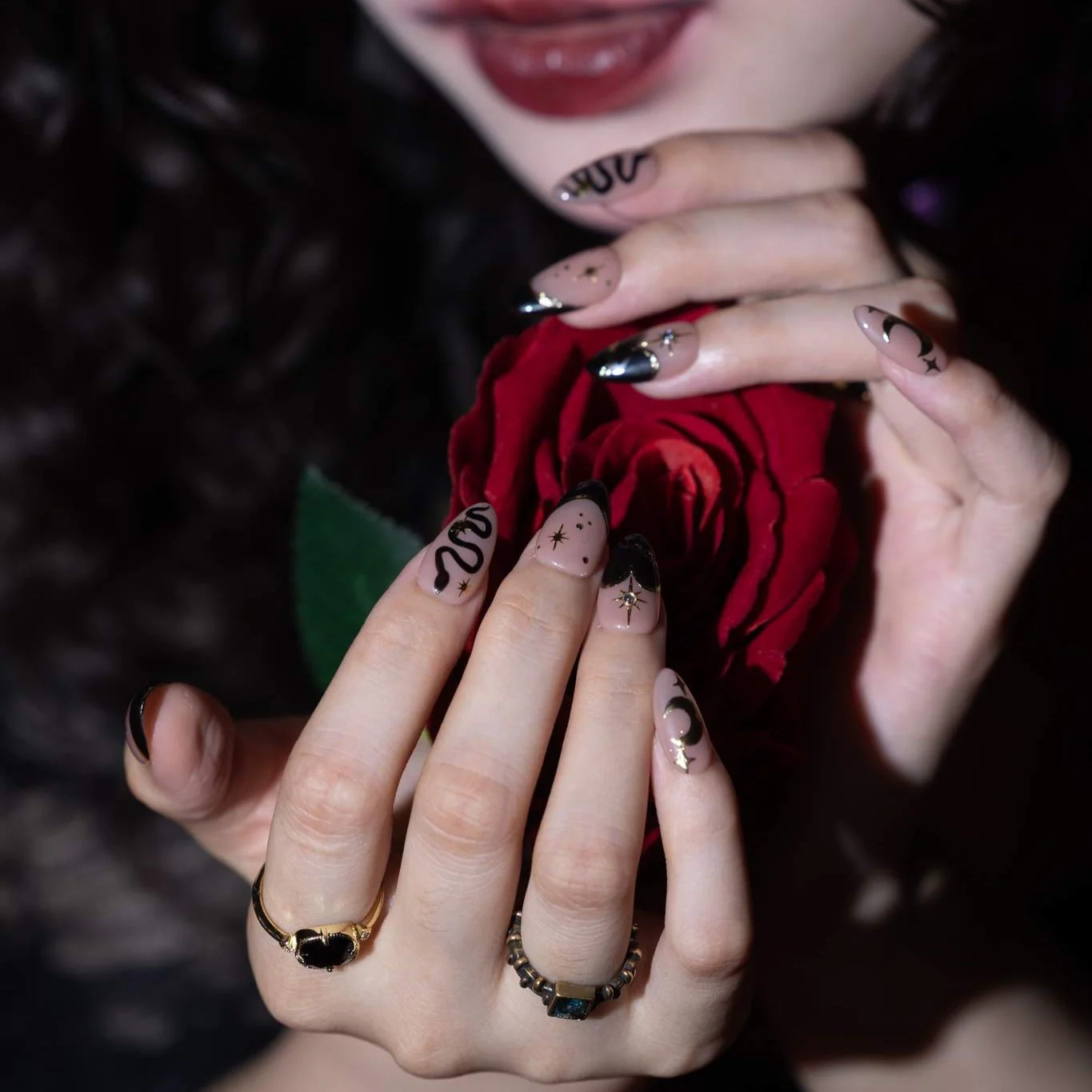 Midnight Madness is the ultimate Halloween statement from Ersa Nails, designed to enchant and intrigue. This striking set features a classic black French tip, adorned with shimmering gold stars and crescent moon decorations that evoke the mysteries of the night. The index finger showcases a captivating snake design, adding an edgy touch to the overall aesthetic. Perfect for those ready to embrace the spooky season, these nails will elevate your Halloween look to new heights.