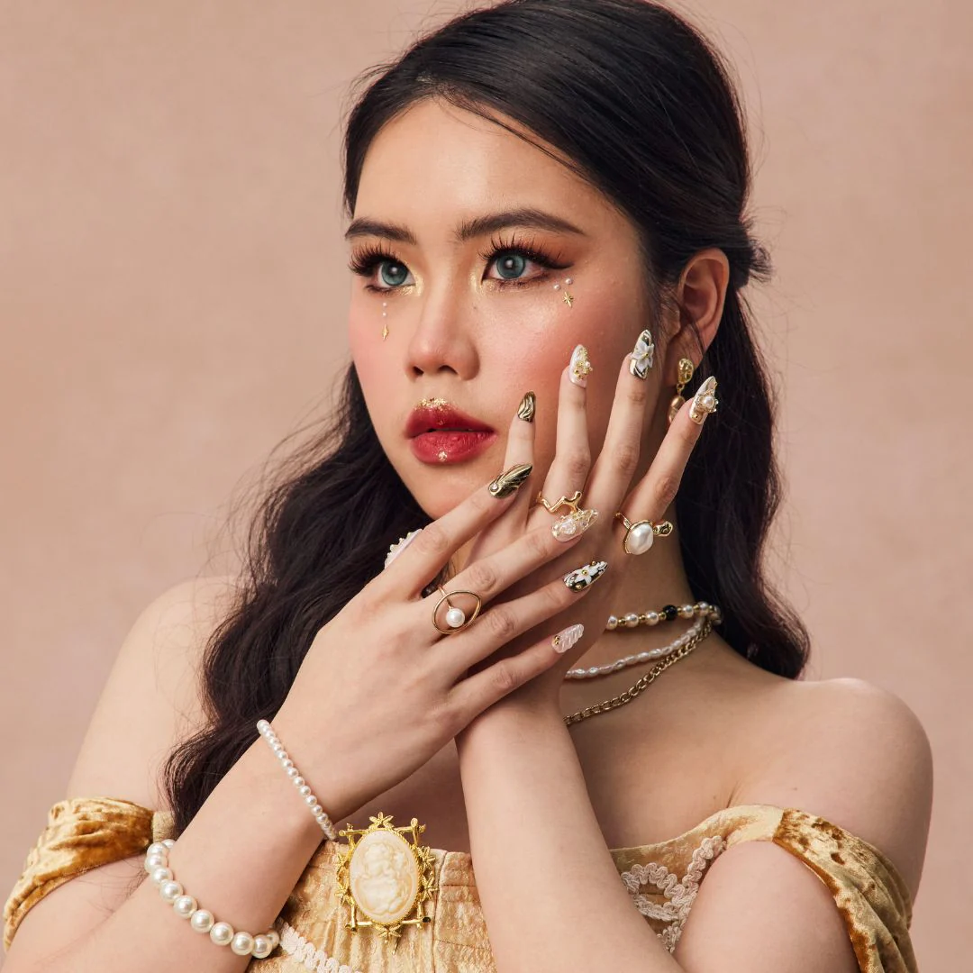 Exude elegance and luxury with Ornament of Grace, a lavishly designed press-on nail set that embodies timeless beauty. The white base gleams with a pearl-like sheen, creating a sophisticated backdrop for stunning gold accents. Intricate golden crosses, hearts, and star embellishments, combined with sparkling diamond details, elevate the design to a new level of opulence. With a 3D mermaid finish adding depth and dimension, this set is perfect for anyone looking to make a statement of grace and grandeur. Whether for a special occasion or a luxurious touch to your everyday look, Ornament of Grace is the epitome of refinement.
