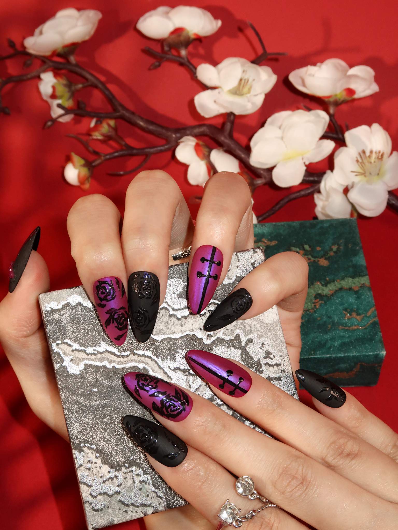 Step into a realm of sophistication with the Qipao press-on nail set, a tribute to the quintessential Chinese gown. Adorned with the aurora-like sheen of purple to mimic the luxurious silk of qipao fabric, these nails are a masterpiece of elegance. Each nail is a canvas showcasing hand-painted, sculpted roses and meticulously handcrafted qipao button knots, bringing the tactile richness of this traditional attire to your fingertips.
