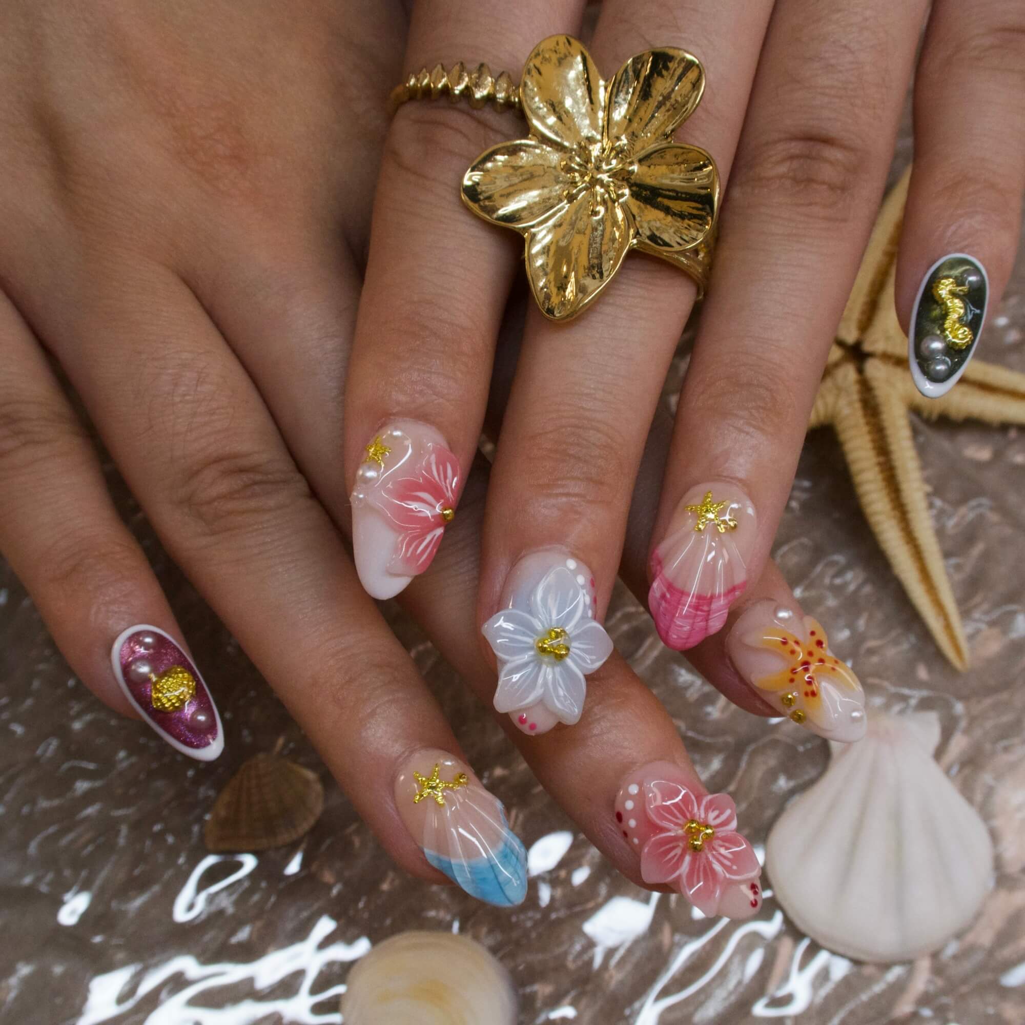 Sea Vivid by Ersa Nails crafts a vibrant coastal narrative. On a soft, neutral base, delicate 3D flowers in pink and white bloom, paired with tiny gold - accented starfish and shell - inspired details. Splashes of ocean - blue and coral - red, along with artful heart and star motifs, mirror the lively charm of a seaside escape. Ideal for infusing daily looks or summer adventures with a burst of floral - meets - ocean energy, capturing the essence of a vivid beachside journey.Â