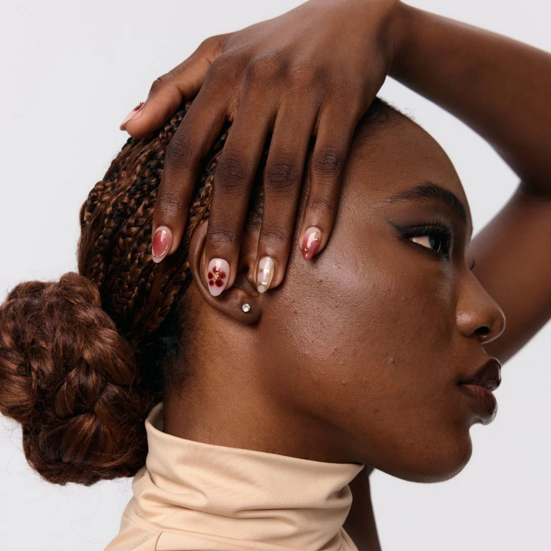Embrace the cozy vibe of sweater weather with Spiced Bloom by Ersa Nails. This short almond set brings the rich hues of the holiday season to life, featuring bold florals and shimmering gold accents that capture the warmth of festive gatherings and crisp, cool days. Perfect for adding a touch of seasonal elegance, Spiced Bloom is designed to make your nails the highlight of the holiday season.